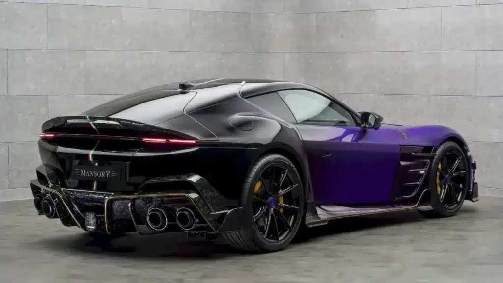 Binnenin gaat het feest vrolijk door. Verwacht Alcantara op plekken waarvan je niet eens wist dat je ze kon bekleden, carbon accenten, en – jawel – paarse veiligheidsgordels. Dat laatste detail voelt bijna als een knipoog naar de Joker. Mansory benadrukt dat het interieur volledig naar wens van de klant kan worden aangepast. En uiteraard vind je overal de Mansory-logo’s, want bescheidenheid past niet bij dit merk.